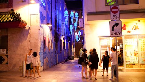 Step into an unassuming Chinatown laneway and find yourself staring at 30 part-human spirits and a series of blue clouds (symbolising never-ending fortune) etched into the paving and painted on the walls. Jason Wing’s artwork In Between Two Worlds draws upon his Chinese and Aboriginal heritage. It’s lit up at night for spectacular after dark shots.