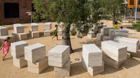Next time you visit, take a moment in the shade of the bottle trees that form part of the enormous While I Live I Will Grow sandstone sculpture. They will tell you about the area's historical connection to water and flooding (Green Square was once a vast wetland) as well as how the community will grow and thrive into the future.