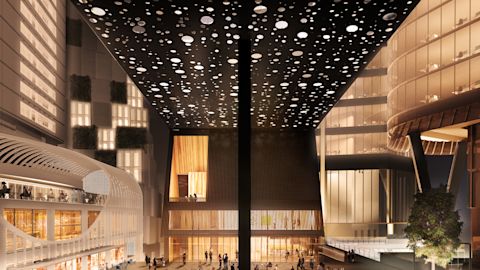 The plaza building design by British architect Sir David Adjaye in partnership with Indigenous artist Daniel Boyd draws design inspiration from Indigenous architecture, culture and gathering. The public artwork takes form as a 20m-high, perforated steel canopy suspended over the public plaza and will be one of the largest Aboriginal installations in Australia.