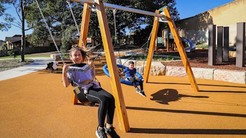 New play equipment, including swings, timber climbing platforms and a slide, and soft rubber surfaces are in place.