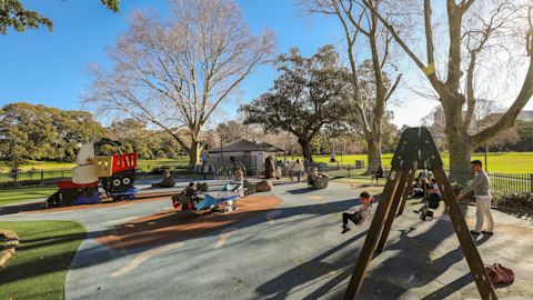 This recently upgraded park boasts large wooden structures, with two long tube slides, obstacle courses and a climbing gym. Nearby is a big open space for running free. Parents love that it’s close to the Tramsheds for snacks, coffee and an excellent parents room.
