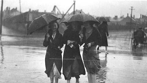 Main image: People crossing a flooded street at Alexandria, 1934. Credit: Sam Hood (State Library of NSW, Home and Away - 412).