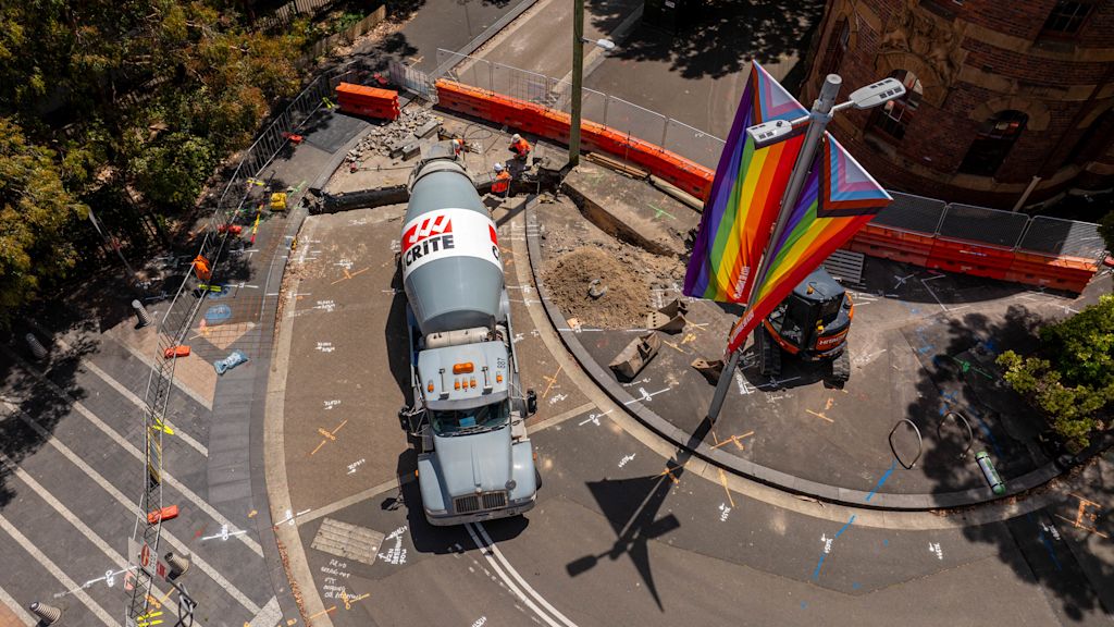 Construction is under way on a new raised intersection at Bourke and Forbes streets in Darlinghurst to proudly celebrate people of diverse sexualities and genders.